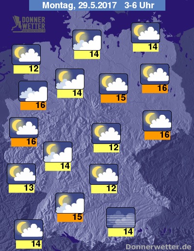 In der kommenden Nacht bleibt es nur im Südosten weiterhin sternenklar, sonst ziehen über der Südosthälfte Deutschland meist nur lockere Wolken durch, die keinen Regen bringen. Weiter nach Norden und Westen hin können auch kompaktere Wolken durchiehen, die örtlich auch Schauer oder Gewitter bringen, zumeist bleibt es aber trocken. Die Temperatur sinkt auf 16 Grad in Berlin und 12 Grad in Oberfranken.