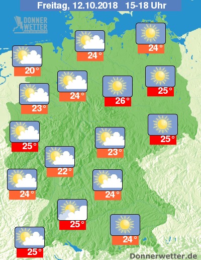 Am frühen Nachmittag halten sich im Westen noch vermehr Schleier- und mittelhohe Wolkenfelder mit milchigem Sonnenschein. Sonst ist der Himmel überwiegend blau oder leicht bewölkt und die Sonne strahlt verbreitet. Mit Temperaturen von 20 bis 25 Grad wird es wieder spätsommerlich warm.