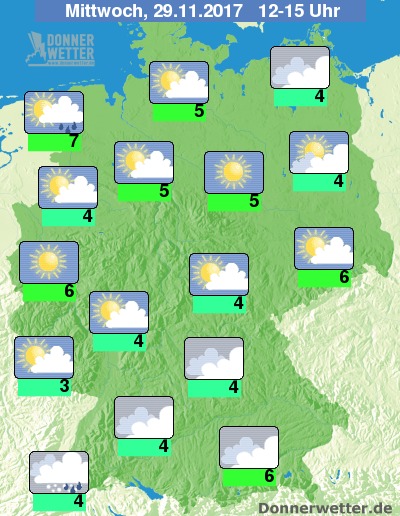 Heute Nachmittag sind im Nordseeumfeld einzelne Schauer möglich, auch sonst ist es im Norden oft stark und nur hier und da aufgelockert bewölkt, dazu jedoch weitgehend trocken. Im Süden ist es stark bewölkt, dazu fällt am Alpenrand hier und da etwas Regen oder Schnee. Im übrigen Land ist es meist heiter, teils sogar sonnig und trocken. Die Temperatur liegt bei 3 bis 7 Grad.