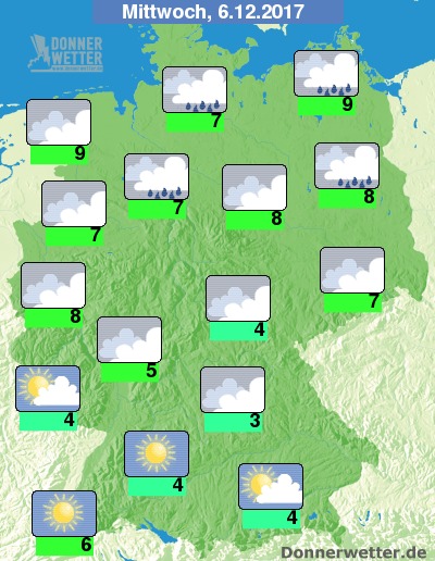 Am Mittwoch ist es im Süden und Südwesten häufig heiter oder sonnig, dabei bleibt es genauso trocken wie über der breiten Landesmitte, wo die Wolkendecke jedoch meist dicht bleibt. Weiter nach Norden und Osten fällt unter kompakten Wolken auch zeitweise Regen. Die Temperatur erreicht 3 bis 9 Grad. An den Küsten weht ein teils stürmischer Wind.
