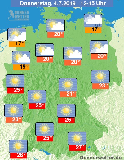 Die Temperaturen bewegen sich im Norden und Osten zwischen 17 und 23 Grad, im Süden und Westen werden meist sommerliche 24 bis 28 Grad erwartet.