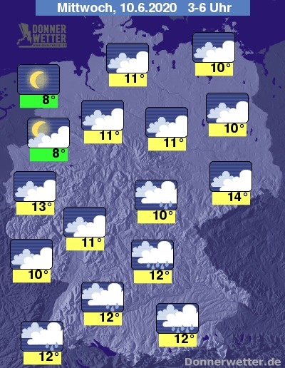Während der zweiten Nachthälfte gehen hauptsächlich von den Mittelgebirgen bis zu den Alpen noch Regengüsse nieder. In den anderen Landesteilen überwiegen zwar ebenfalls die Wolken, doch sollte es weitgehend trocken bleiben. Lediglich im Nordwesten klart der Himmel auf und man kann für längere Zeit Mond und Sterne beobachten.