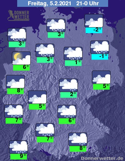 In den Abendstunden bleibt der Himmel über weiten Landesteilen bedeckt, zwischen Münsterland und Rheinland kann es zeitweise auch mal auflockern. Verbreitet muss in den Abendstunden mit teils ergiebigem Niederschlag gerechnet werden, der im norddeutschen Tiefland auch als Schneeregen oder Schnee fallen kann. Regional ist Straßenglätte möglich.