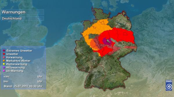 Kompakte Wolken sorgen in vielen Landesteilen wieder für teils kräftigen Regen und Schauer, örtlich blitzt und donnert es auch wieder. Außerdem kann es regional wieder zu kleinräumigen Überschwemmungen kommen. Im Laufe des Nachmittags wird es von Sachsen bis ins südliche Brandenburg etwas freundlicher und trocken. Die Höchsttemperaturen bewegen sich meist bei kühlen 14 bis 20 Grad.