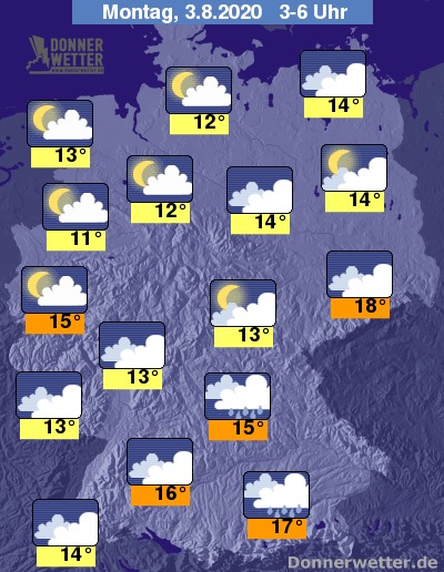 In der Nacht zum Montag fällt südöstlich einer Linie vom Bodensee bis zum Erzgebirge zum Teil kräftiger und langanhaltender Regen. Weiter nach Nordwesten hin ist es verbreitet stark bewölkt, jedoch weitgehend trocken. Im Norden und Westen ist es meist locker bis aufgelockert bewölkt und dazu trocken. Die Temperatur sinkt auf 18 Grad in Dresden und bis 11 Grad im Münsterland.