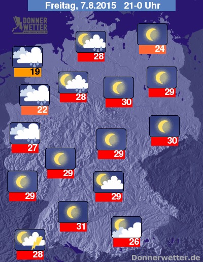Heute Abend ziehen im Westen, Nordwesten und Norden dichte Wolken auf und es bilden sich verbreitet Schauer und zum Teil kräftige Gewitter. Auch am Alpenrand ist es oft stark bewölkt, dabei besteht jedoch nur ein leichtes Schauer- und Gewitterrisiko. Im übrigen Land bleibt der Himmel meist sternenklar oder auch gering bewölkt und es bleibt trocken. Die Abendtemperatur liegt bei heißen 31 Grad in Karlsruhe und bei kühlen 19 Grad in Ostfriesland.