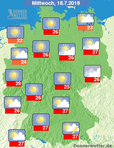 Am Mittwoch ist es verbreitet sonnig, zum Teil ziehen nur wenige Wolken übers Land hinweg, dabei bleibt es trocken. Im Osten und Nordosten ist es hingegen oft auch stark bewölkt, an der Grenze zu Polen und an der Ostsee fällt zudem gebietsweise Regen, sonst bleibt es aber trocken. Die Temperatur steigt auf 22 Grad in Wilhelmshaven und bis 29 Grad in Dortmund.