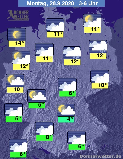 In der Nacht zum Montag fällt von Berlin-Brandenburg bis nach Sachsen-Anhalt unter dichten Wolken zeitweise Regen. Im übrigen Land ist es auch oft stark, teils aber auch nur locker bis aufgelockert bewölkt, dazu bleibt es trocken. Die Temperatur sinkt auf 14 Grad an den Küsten und bis 4 Grad in Unterfranken.