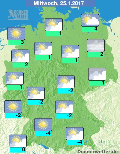 Am Mittwoch zeigt sich der Himmel dann meist wechselnd oder stark bewölkt, entlang der Nordsee sowie im Südwesten kann sich die Sonne auch mal länger zeigen. Schauer sind zur Wochenmitte aber nicht zu erwarten. Die Temperaturen erreichen Höchstwerte um -4 bis +4 Grad C.