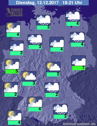Heute Abend ist es in einem breiten Streifen vom Südwesten, dem Westen bis nach Thürigen und Sachsen locker oder aufgelockert bewölkt und trocken. Auch an der Nordsee ist es häufiger aufgelockert bewölkt und trocken. Sonst ziehen allerdings meist dichte Wolken durch und es fällt zeitweise Regen, Schneeregen oder Schnee. Es besteht zum Teil Glättegefahr! Die Abendtemperatur liegt bei 2 bis 7 Grad.
