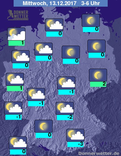 In der Nacht zum Mittwoch lockert der Himmel über dem Land verbreitet auf, gebietsweise wird es auch sternenklar, dazu bleibt es trocken. Die Temperatur sinkt auf 1 bis -3 Grad.