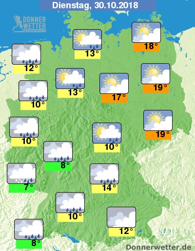 Am Dienstag ist es vom Nordosten bis in den Osten oft heiter oder aufgelockert bewölkt und dabei trocken. Weiter nach Westen hin bleiben die Wolken dagegen dicht und vor allem über der Westhälfte fällt teils langanhaltender Regen. Die Temperatur steigt auf 7 Grad am Pfälzer Wald und bis 19 Grad in der Lausitz.