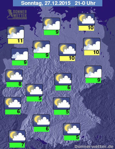 In der Nacht zum Montag ist es im äußeren Norden und im Nordosten oft sternenklar, im übrigen Norden ist es teils aufgelockert, teils aber auch stark bewölkt, jedoch weitgehend trocken. Weiter nach Süden hin ziehen verbreitet nur lockere, teils auch einige Wolken übers Land hinweg, dazu bleibt es trocken. Die Temperatur sinkt auf 10 Grad in Meppen und bis 2 Grad am Westerwald.