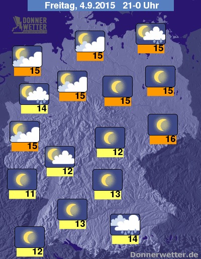 Heute Abend ziehen im äußeren Westen, im Nordwesten und auch im Norden gebietsweise dichte Wolken durch, die zu einzelnen Schauern führen können. Am Alpenrand ist es oft bedeckt und es fällt teils anhaltender Regen, sonst zeigt sich der Himmel über Deutschland hingegen weitgehend sternenklar und es bleibt dazu trocken. Die Abendtemperatur liegt bei 16 Grad in Riesa und etwa 11 Grad am Taunus.