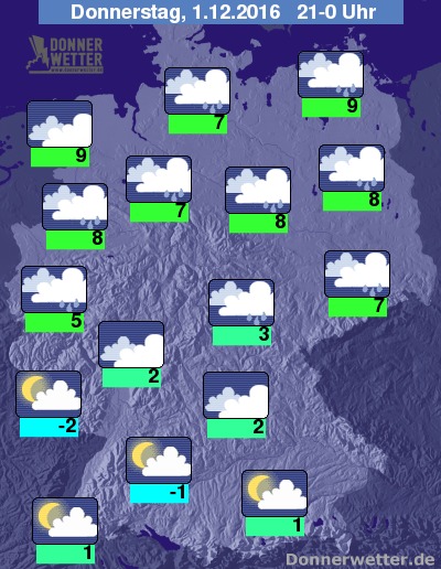 Die erste Nachthälfte beschert dem Norden des Landes weitere Regenfälle, während im äußersten Süden mitunter auch die Sterne funkeln. Unter bedecktem Himmel steht uns eine recht milde Nacht bevor, die Temperaturen fallen gegenüber dem Tag kaum und liegen bei Werten um die 8 Grad. Wo es aufklart, ist mit Tiefstwerten um den Gefrierpunkt zu rechnen.