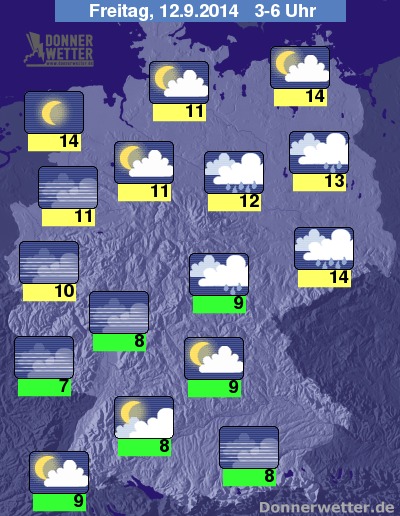In der kommenden Nacht bilden sich im Süden bei teils dichten Wolken zunächst noch einzelne Schauer, Gewitter bleiben eher selten, nach Mitternacht klingen hier die Niederschläge meist ab. Im Osten halten sich die meist dichten Wolken dagegen verbreitet bis zum Morgen und es fällt immer wieder Regen. Nur locker bewölkt oder auch sternenklar bleibt es in der Nordwesthälfte der Republik, hier ist jedoch stellenweise mit Nebel oder Hochnebel zu rechnen, dafür bleibt es hier trocken. Die Temperatur sinkt auf 14 Grad in der Lausitz und etwa 7 Grad im Saargau.
