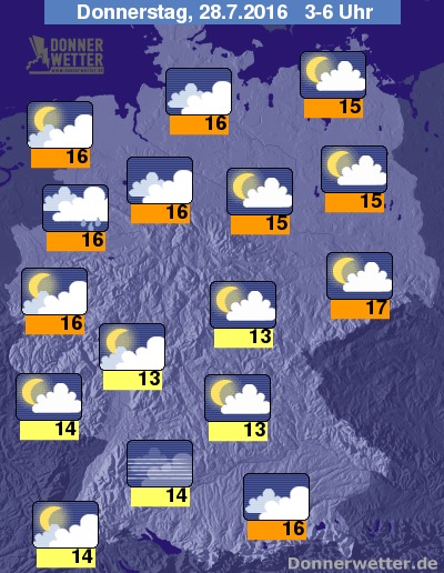 In der Nacht zum Donnerstag bilden sich in den östlichsten Landesteilen anfangs noch häufig Schauer und mögliche Gewitter. Im weiteren Nachtverlauf und im übrigen Bundesgebiet ist der Himmel zumeist locker oder aufgelockert bewölkt und es bleibt zunächst trocken. In der zweiten Nachthälfte ziehen im Westen und Nordwesten jedoch oft dichte Wolken auf und es bilden sich gebietsweise Schauer. Die Temperatur sinkt auf 17 Grad in der Lausitz und etwa 13 Grad im Eichsfeld.