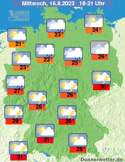 Am Donnerstag halten sich vor allem im Norden und Nordosten oft dichte Wolken und es bilden sich gebietsweise Schauer. Im übrigen Land ist es teils heiter, teils stark bewölkt und es besteht ein leichtes bis mäßiges Schauer- und Gewitterrisiko. Die Temperatur erreicht 19 Grad an den Küsten und bis 31 Grad im Breisgau.