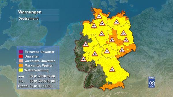 Im Südwesten und Westen lockert es gegen Mitternacht oft wieder auf und die Niederschläge klingen meist ab. Die Abendtemperatur liegt bei 7 Grad im Breisgau und um -4 Grad in Berlin. Im Norden weht teils starker, an den Küsten und auf den Bergen oft stürmischer Wind.