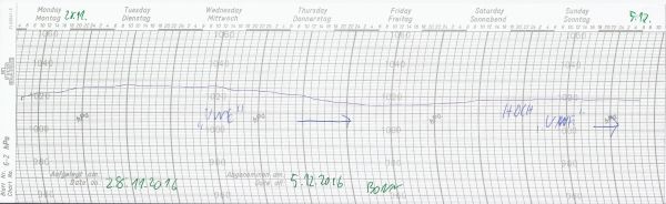Hoher Luftdruck begleitet uns auch noch zu Beginn dieser Woche. Unser Schrieb zeigt den Luftdruckverlauf an unserer Wetterstation in Bonn zwischen dem 28.11. und dem 05.12.2016. Gut zu erkennen gibt sich Hoch "Uwe":