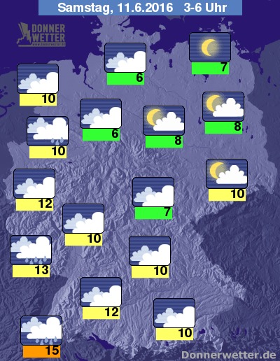 In der Nacht zum Samstag ist es zunächst noch verbreitet leicht oder aufgelockert bewölkt und trocken, im Südwesten sind bei oft starker Bewölkung einzelne Schauer möglich, im Nachtverlauf nimmt die Bewölkung über der Südwesthälfte deutlich zu, dabei fällt vom Süden, über den Südwesten bis in den äußeren Westen der Republik gebietsweise Regen, sonst bleibt es aber trocken. Die Temperatur sinkt auf 15 Grad in Freiburg und etwa 7 Grad an der Müritz.
