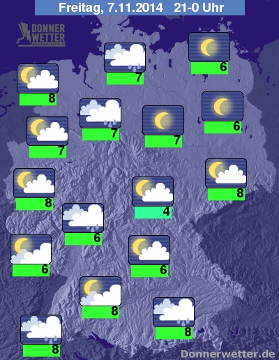 Heute Abend fällt in einem Streifen vom Schwarzwald, über Hessen bis nach Schleswig-Holstein zeitweise Regen, westlich davon lockert die Bewölkung wieder auf und es bleibt weitgehend trocken. Regen fällt unter dichten Wolken ebenso im Südosten des Landes, sonst ist der Himmel jedoch meist nur locker bewölkt oder auch sternenklar und es bleibt trocken. Die Abendtemperatur liegt bei 8 Grad in Köln und etwa 4 Grad am Thüringer Schiefergebirge.