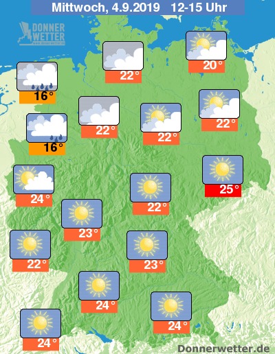 Die Temperaturen liegen im Emsland und an der See meist nur zwischen 16 und 20 Grad, sonst werden nochmals angenehm warme 21 bis 25 Grad erreicht.