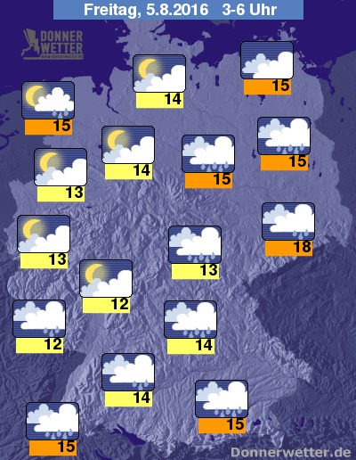 In der Nacht zum Freitag bleibt es über der Südosthälfte der Republik weitgehend bedeckt und es fällt zeitweise, oft auch langanhaltender und zum Teil ergiebiger Regen. Im Südosten und am Erzgebirge sind stellenweise starke Gewitter möglich. Weiter nach Norden und Westen hin ist die Bewölkung hier und da aufgelockert, oft aber auch stark bewölkt, dabei bleibt es weitgehend trocken. Die Temperatur sinkt auf 18 Grad in Dresden und bis etwa 12 Grad in der Wetterau.