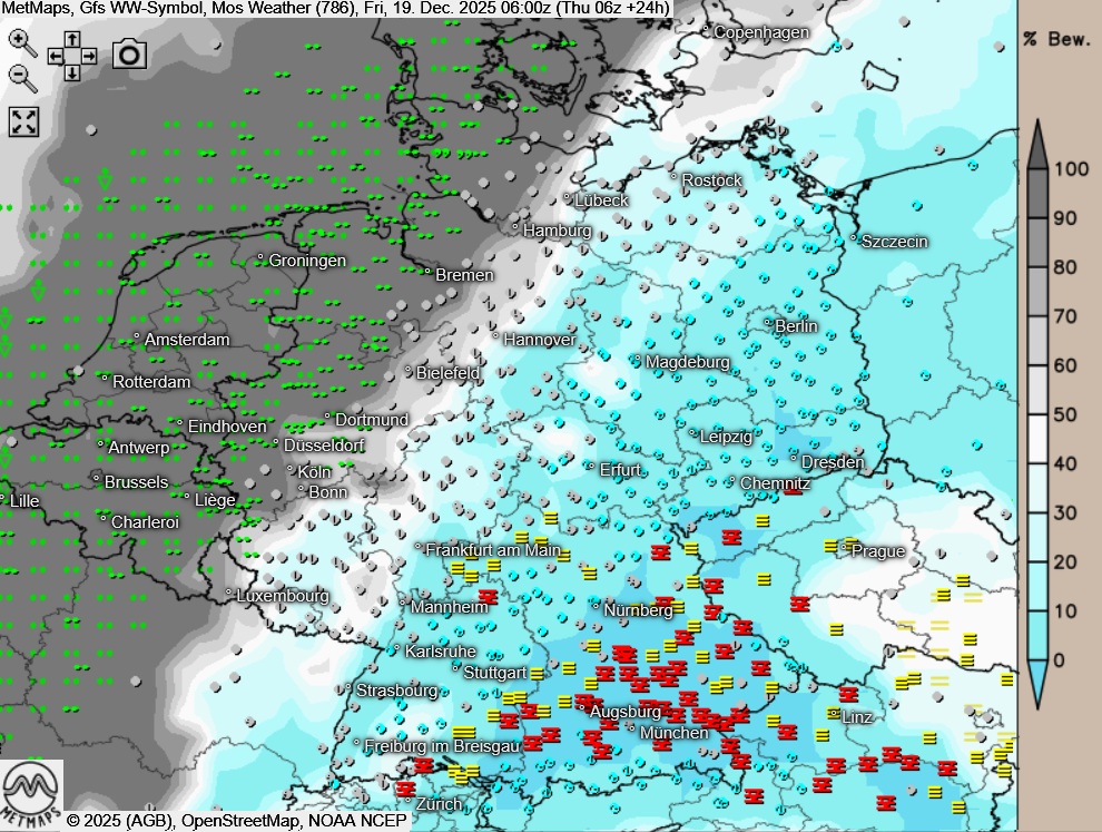 Die Temperatur- und Wetterkarte für Dienstagmorgen (06:00 Uhr) nach GFS: