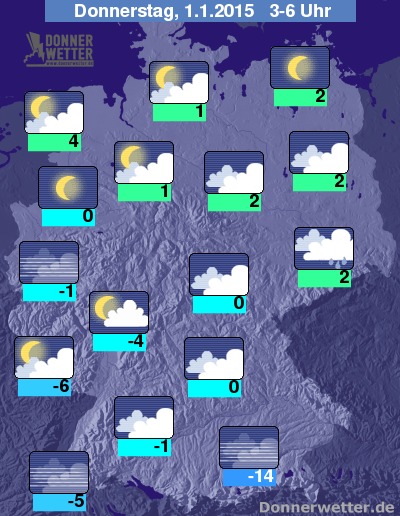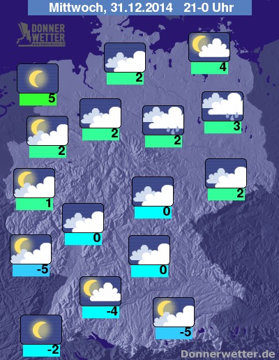 In der Nacht zum 1. Januar fällt nur noch im Osten unter dichten Wolken gelegentlicher Regen, vor allem in der Osthälfte, mit Ausnahme des Ostseeumfelds, bleibt es jedoch weitgehend bedeckt oder neblig-trüb. Weiter nach Westen kann sich die Bewölkung aber auch häufig auflockern, dazu bleibt es hier ebenfalls trocken. Es bildet sich stellenweise Nebel oder Hochnebel. Die Temperatur sinkt auf 4 Grad in Emden und bis streng frostige -14 Grad in München.