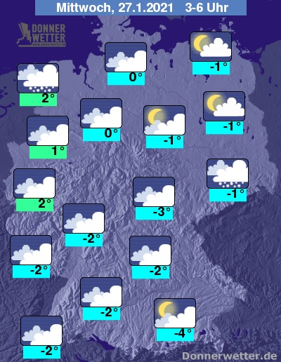 Während der zweiten Nachthälfte fällt über den Mittelgebirgen und Teilen Bayerns noch gelegentlich Schnee oder Schneeregen mit erhöhter Rutschgefahr. Sonst wechseln sich dichtere Wolken mit Aufklarungsphasen ab. Im Norden fällt regional etwas Schnee oder Regen.