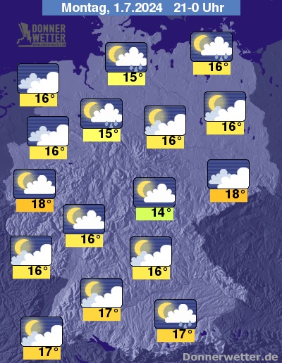 In der Nacht zum Dienstag sind vor allem in der Nordhälfte sowie südlich der Donau noch schauerartige Regenfälle und lokale Gewitter möglich. In den übrigen Landesteilen bleibt es bei meist auflockernder Bewölkung niederschlagsfrei.