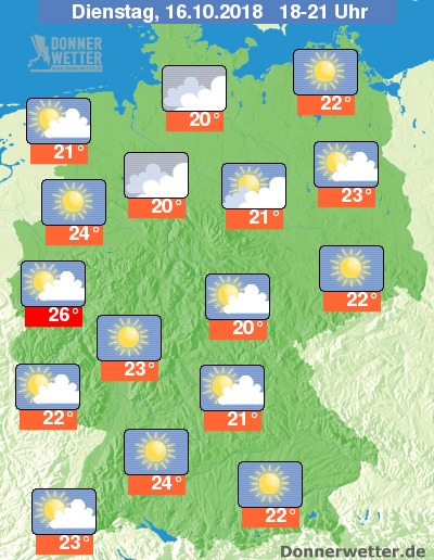 Am Abend lassen letzte Schauer nach und der Himmel präsentiert sich teils bewölkt, teils klar. Die untergehende Sonne spendet vielerorts noch goldene und wärmende Strahlen. Vor Beginn der Dämmerung liegen die Temperaturen noch bei angenehmen 20 bis 24 Grad, in den Ballungsgebieten des Westens teilweise sogar noch über 25 Grad.