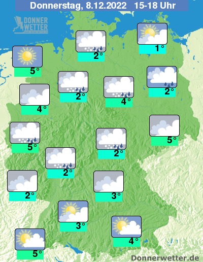 In den Nachmittagsstunden zeigt sich der Himmel über dem Süden des Landes sowie zeitweise auch in Küstennähe heiter oder es ist nur leicht bewölkt. Südlich des Mains bleibt es dabei meist trocken. In den übrigen Landesteilen bleibt der Himmel stark bewölkt oder ist bedeckt und zeitweise muss mit Niederschlägen gerechnet werden, die in den nördlichen und zentralen Mittelgebirgen auch als Schnee fallen können.