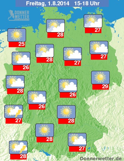 Heute Nachmittag strahlt fast überall die Sonne und es ziehen meist nur harmlose Wolken durch. Gebietsweise ist der Himmel sogar wolkenlos. Im Südwesten ziehen jedoch teilweise auch dichtere Quellwolken auf und lokal können sich auch Schauer und Gewitter entwickeln, sonst bleibt es aber verbreitet trocken. Die Temperatur liegt bei sommerlichen warmen 25 Grad in Ostfriesland und sehr warmen 29 Grad in der Lausitz.
