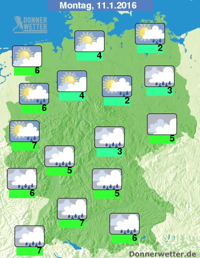 Heute lockert die Bewölkung im Norden des Landes häufig auf und hier bleibt es auch größtenteils trocken. Im übrigen Bundesgebiet bleibt der Himmel dagegen überwiegend stark bewölkt oder bedeckt und es fällt immer wieder Regen, im Osten auch teils Schneeregen. Die Temperatur steigt auf 2 Grad in Neubrandenburg und bis etwa 7 Grad am Mittelrhein. Besonders im Süden weht ein oft starker und teils stürmischer Wind.