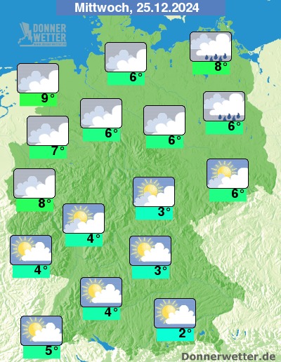 Am 1. Weihnachtsfeiertag ist es vor allem an den Alpen oft heiter, aber auch im übrigen Süden kann sich gebietsweise die Sonne zeigen, dabei bleibt es trocken. Weiter nach Norden hin ist es hingegen meist bedeckt, dabei fällt im Nordosten etwas Regen, sonst bleibt es weitgehend trocken. Die Temperatur steigt auf 2 Grad in Oberbayern und bis 9 Grad im nördlichen Emsland.