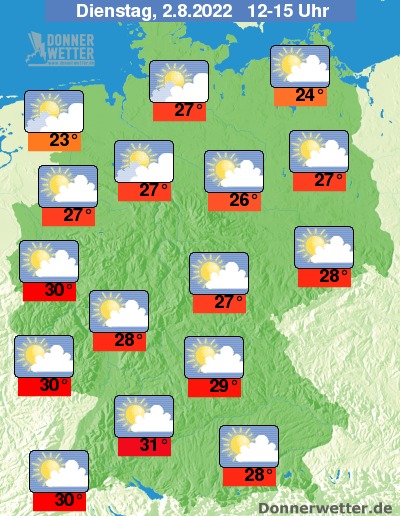 Heute Nachmittag ist es verbreitet heiter oder sonnig, hier und da ziehen auch einige und teils auch dichtere Wolken durch, dabei bleibt es weitgehend trocken. Die Temperatur liegt bei 23 Grad an der Nordsee und etwa 31 Grad in Schwaben.