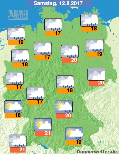 Heute bleiben und die dichten Wolken weitgehend erhalten, Auflockerungen sind am ehesten im Süden Deutschlands zu erwarten, dazu bilden sich im Süden einzelne Schauer, im übrigen Bundesgebiet fällt immer wieder Regen. Die Temperatur erreicht nur 17 Grad in der Norddeutschen Tiefebene und bis 21 Grad im Breisgau.