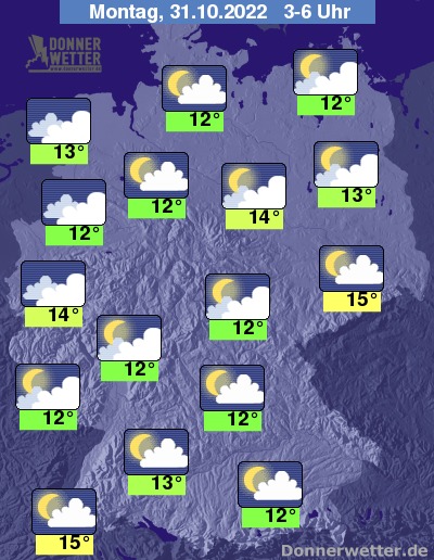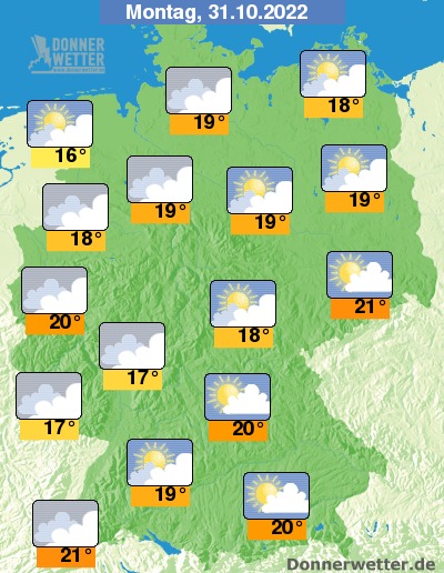 Am Montag bleibt es im Osten und Südosten des Landes noch überwiegend heiter bis sonnig. Im übrigen Land ist es zum Teil noch locker, oft jedoch schon stark bewölkt oder trüb. Es bleibt landesweit trocken bei Höchstwerten von 16 Grad in Wilhelmshaven und bis 21 Grad in Dresden.