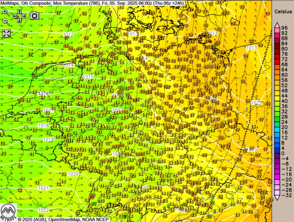 Die Strömungs- und Temperaturkarte für Freitagfrüh (06:00 Uhr) nach GFS:
