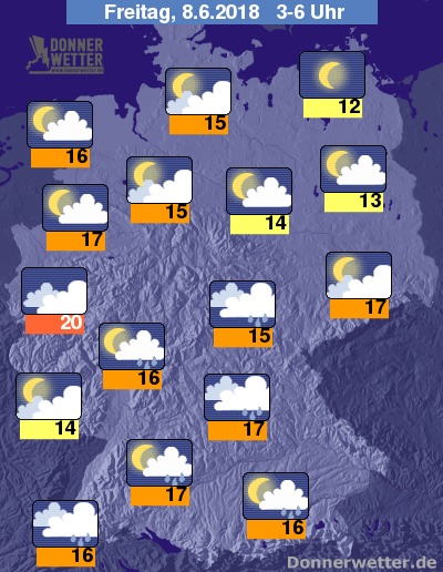 In der Nacht lassen dann zunächst die Gewitter nach und bis zum Morgen ist an Rhein, Main und Donau nur noch mit vereinzelten Schauern zu rechnen. Ansonsten ist der Himmel im Süden meist wechselnd oder dicht bewölkt, während die Wolkenlücken im Norden recht groß sind und stellenweise die Sterne funkeln.