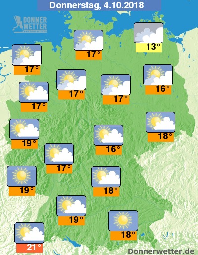 Nach Auflösung von Nebelfeldern scheint verbreitet die Sonne von einem meist nur leicht bewölkten Himmel. Nur im Norden ziehen teilweise dichtere Wolken vorüber und örtlich kann es etwas tröpfeln oder zu leichten Schauern kommen. Nach kühlem Morgen erwärmt sich die Luft mit der Kraft der Oktobersonne immerhin schon auf 15 bis 19 Grad, am Oberrhein und im Markgräflerland sind bereits schon Werte von über 20 Grad möglich. Kühler bleibt es allerdings noch im Ostseeumfeld.