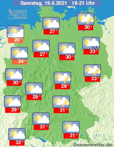 Heute Nachmittag ist es verbreitet heiter, gebietsweise ziehen jedoch auch dichte Quellwolken durch, dabei sind vereinzelt Schauer und auch Gewitter möglich. Die Temperatur liegt bei eher kühlen 19 Grad an der Nordsee und schweißtreibenden 33 Grad in der Lausitz.