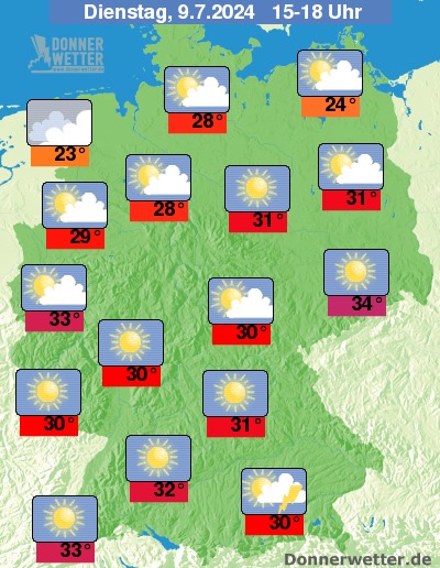 Die Temperaturen erreichen Höchstwerte um 23 Grad in Küstennähe und bis 34 Grad im östlichen Sachsen.