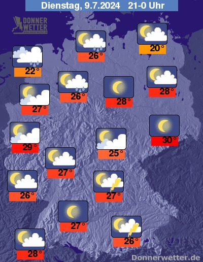 In der Nacht zum Mittwoch nimmt die Bewölkung über den westlichen Landesteilen zu und es sind teils kräftige Schauer und Gewitter möglich, die im weiteren Verlauf auch in die Mitte und den Osten der Republik vorankommen. Im Nordosten und Südosten ist es teils sternenklar, teils locker bewölkt und es bleibt überwiegend trocken.