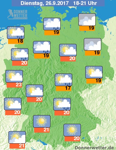 Heute Abend bleibt es im Westen und Süden meist heiter bis sonnig und trocken, über Thüringen und Nordbayern ziehen teils dichte Wolken mit möglichen Schauern und Gewittern durch. Im übrigen Bundesgebiet ist es oft stark, teils aufgelockert bewölkt, dazu bilden sich gebietsweise Schauer, örtlich auch Gewitter. Die Temperatur liegt bei 17 Grad im Eichsfeld und bis 23 Grad in Köln.