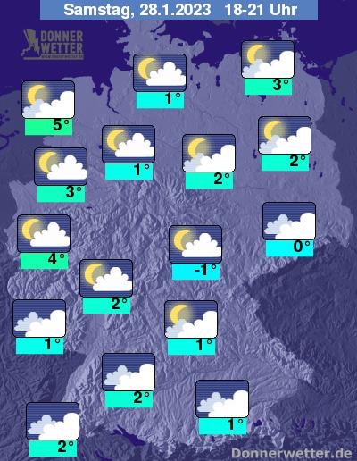 Heute Abend halten sich vor allem im Alpenvorland meist dichte Wolken, dazu bleibt es weitgehend trocken. Im übrigen Land ist es oft auch locker bis aufgelockert, teilweise aber auch stark bewölkt, jedoch bleibt es trocken. Die Temperatur liegt bei -1 Grad im Vogtland und bis 5 Grad an der Nordseeküste.