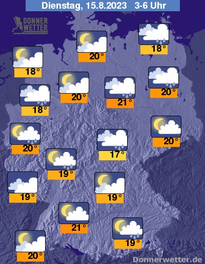 In der Nacht zum Dienstag zeigt sich der Himmel zeitweise locker, zeitweise aber auch dicht bewölkt. Es können sich gebietsweise Schauer, örtlich auch Gewitter entwickeln. Die Temperatur sinkt auf tropische 21 Grad in Stuttgart und bis etwa 17 Grad in Jena.