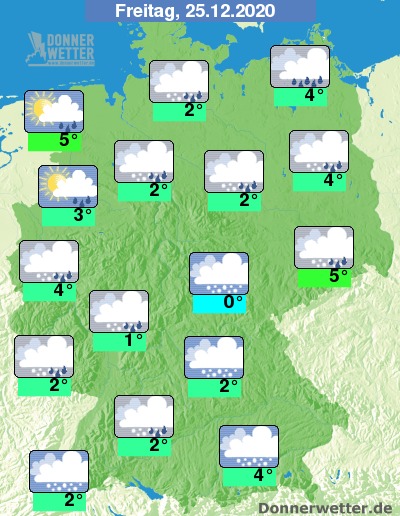 Meist stark bewölkt und häufig Regen, in der Nacht auf den ersten Weihnachtsfeiertag zurückgehende Temperaturen und gebietsweise Schneefall oder Schneeregen.